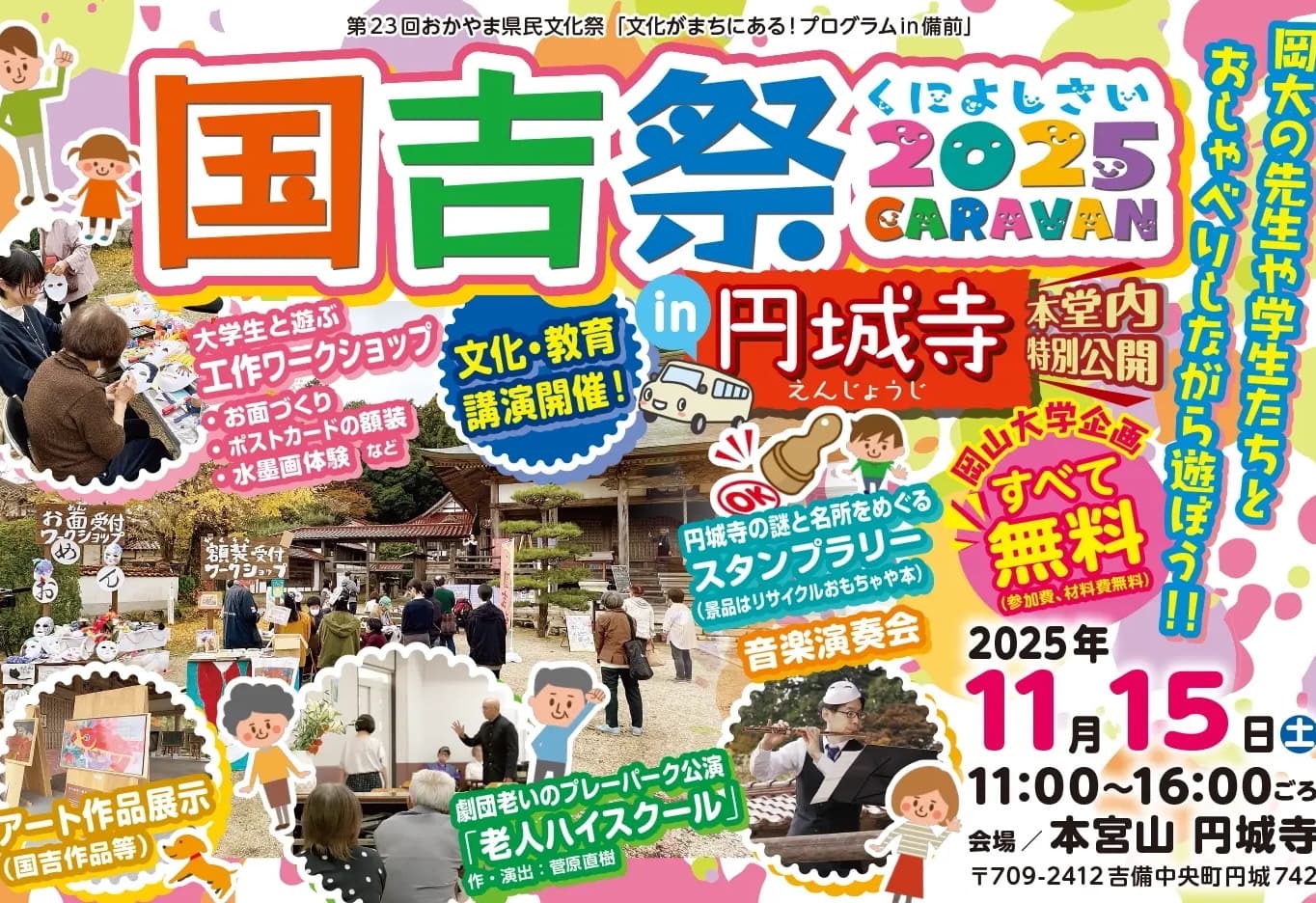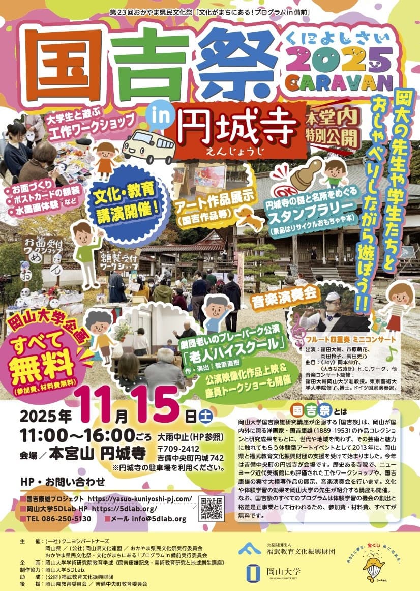 「国吉祭」の企画と運営は、岡山大学の学生が担当し、当日も学生がワークショップや工作制作のお手伝い、境内の「探検」をしながら、子供たちや地域の方たちとの交流を楽しみにまいります。当日のプログラムの詳細は、順次発表していきます。