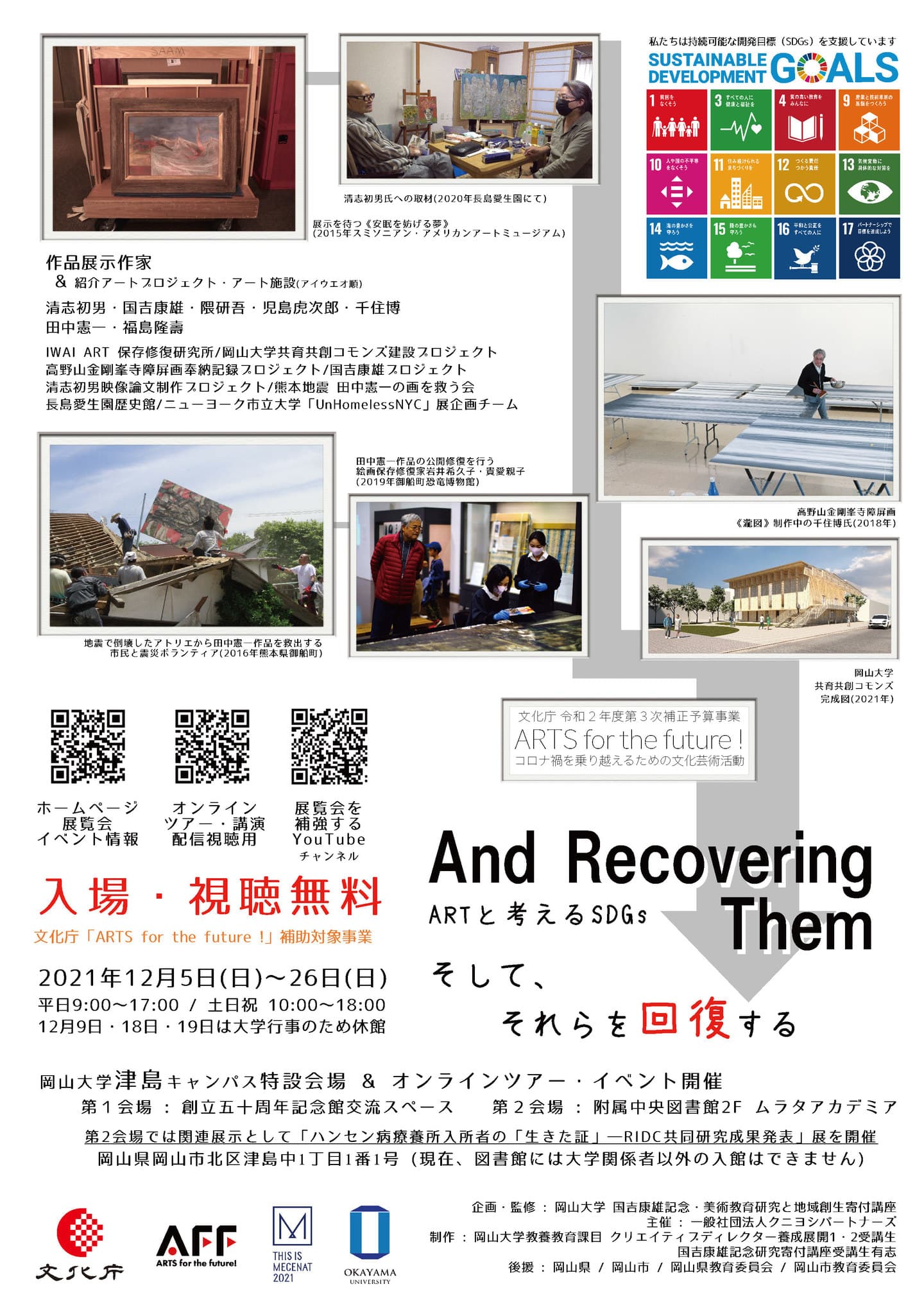 わたしたちは「SDGs課題の解決」という目標を達成しなければならないほど逼迫した現代を生 きています。そこで、岡山大学国吉康雄記念研究寄付講座では「SDGsという視点」で「既にある作品、表現、進行中のプロジェクト」を読み解く展覧会「And Recovering Them そして、それらを回復する」展を企画し、岡山大学内に、地域に開かれたコミュニティーミュージアムを期間限定で臨時設置することといたしました。